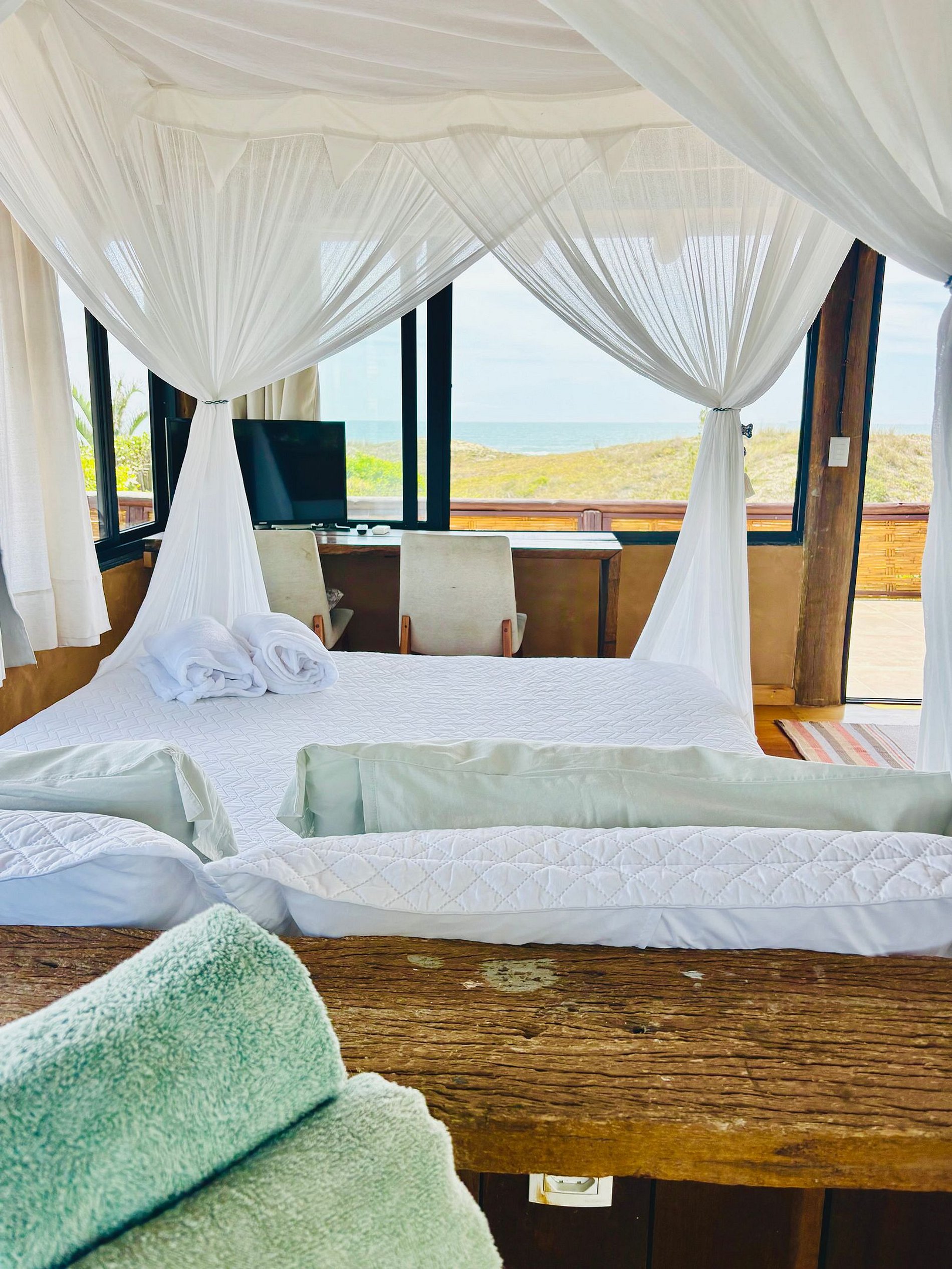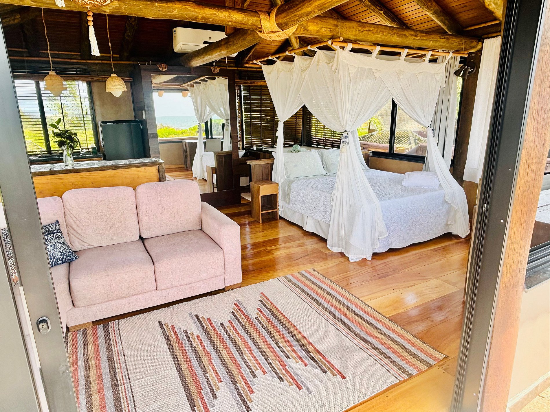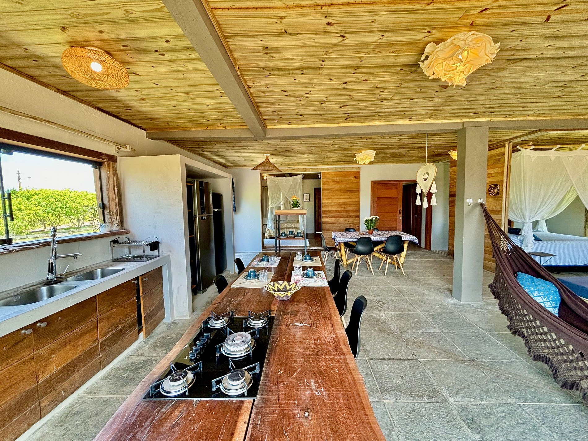 O aluguel inclui todo o ESPAÇO NA PRAIA No térreo, painéis móveis que podem compor uma suite e um dormitório, ambos com ar-condicionado, um espaço amplo integrado com sala (sofa composto por 3 camas de casal) e cozinha, abertos para um deck e as dunas, mais um banheiro grande. No andar superior, o STUDIO GEA NA PRAIA - que é nossa 'Suite Lua de Mel', com banheira e também uma cozinha, com a vista do mar. No pátio temos um grande gramado, decks e um espaço para fogueira ao som das ondas do mar.