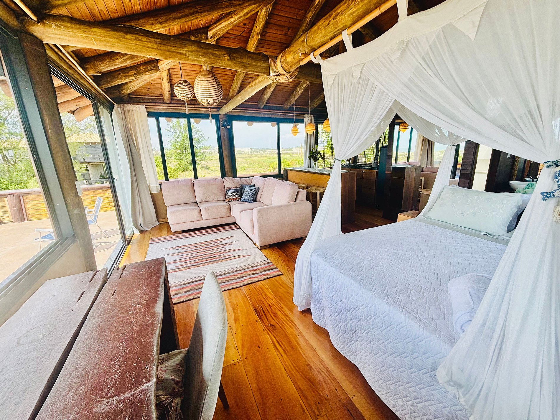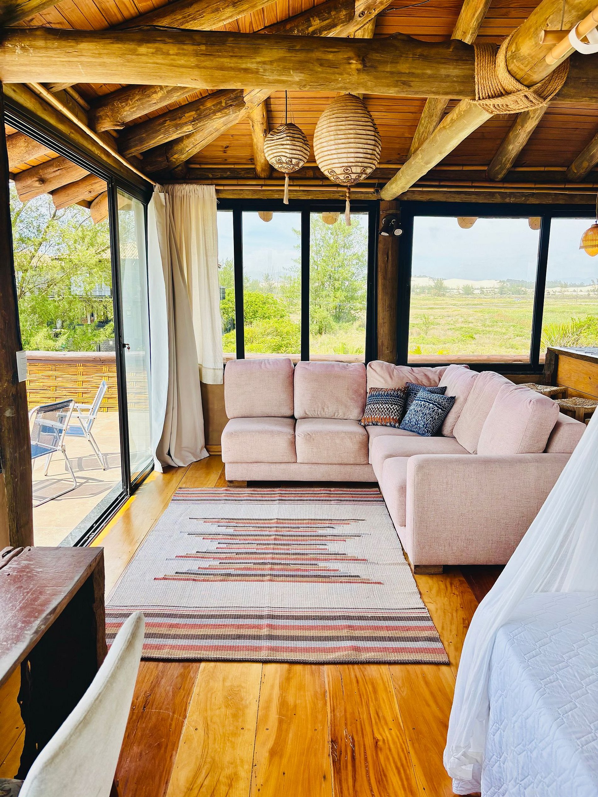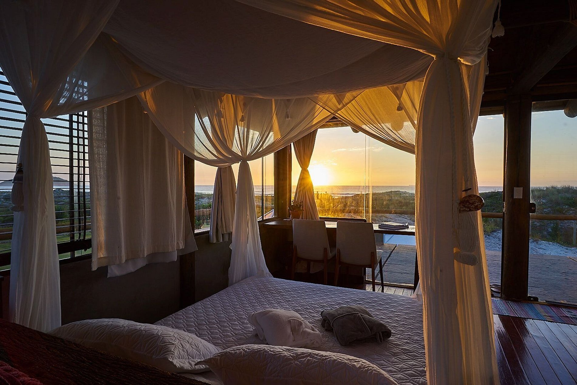 O aluguel inclui todo o ESPAÇO NA PRAIA No térreo, painéis móveis que podem compor uma suite e um dormitório, ambos com ar-condicionado, um espaço amplo integrado com sala (sofa composto por 3 camas de casal) e cozinha, abertos para um deck e as dunas, mais um banheiro grande. No andar superior, o STUDIO GEA NA PRAIA - que é nossa 'Suite Lua de Mel', com banheira e também uma cozinha, com a vista do mar. No pátio temos um grande gramado, decks e um espaço para fogueira ao som das ondas do mar.