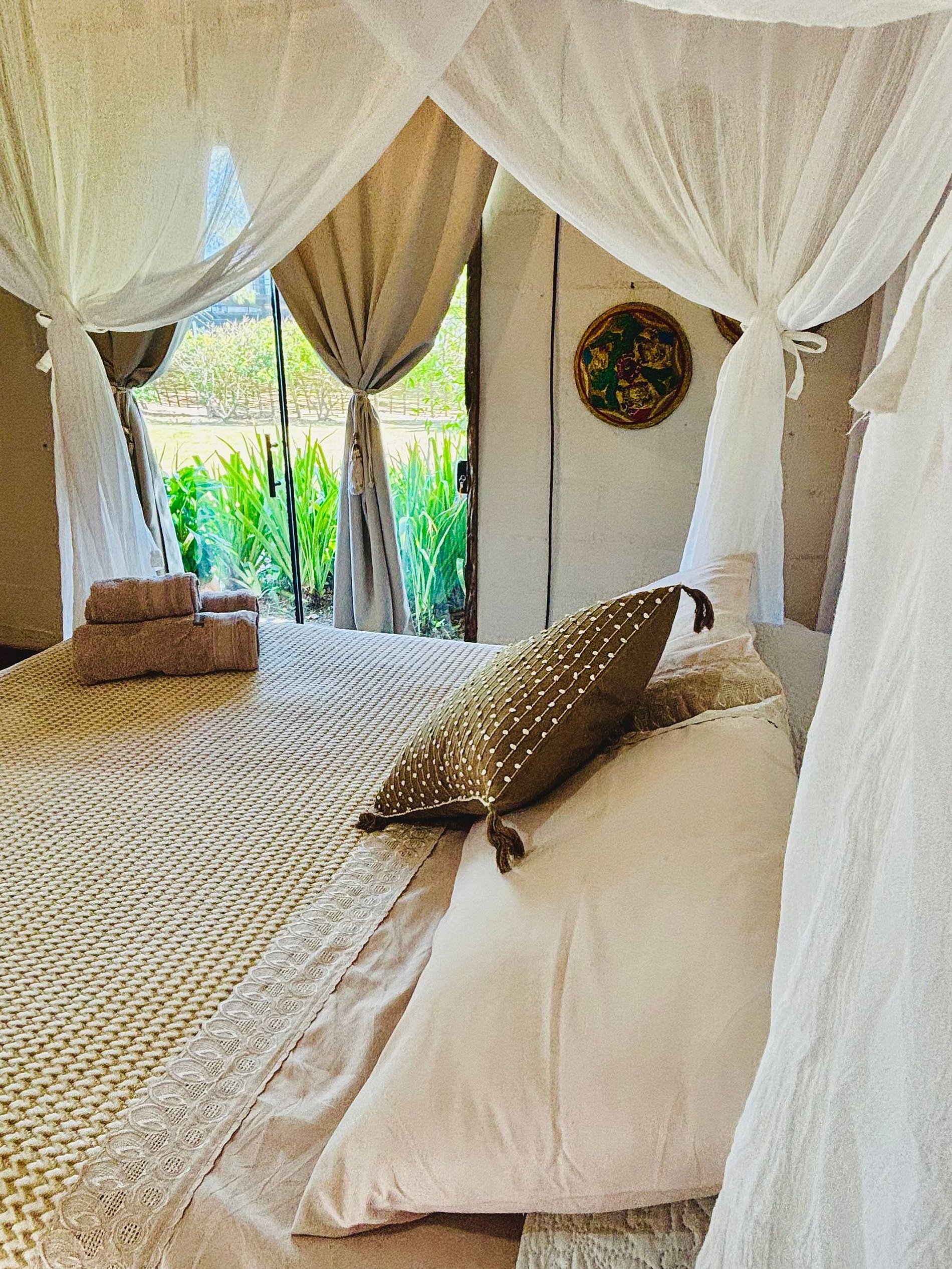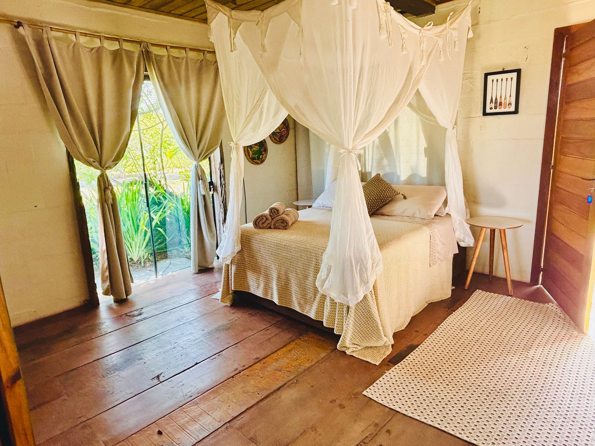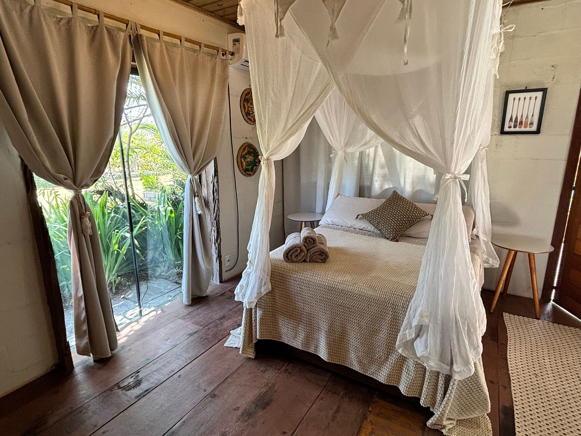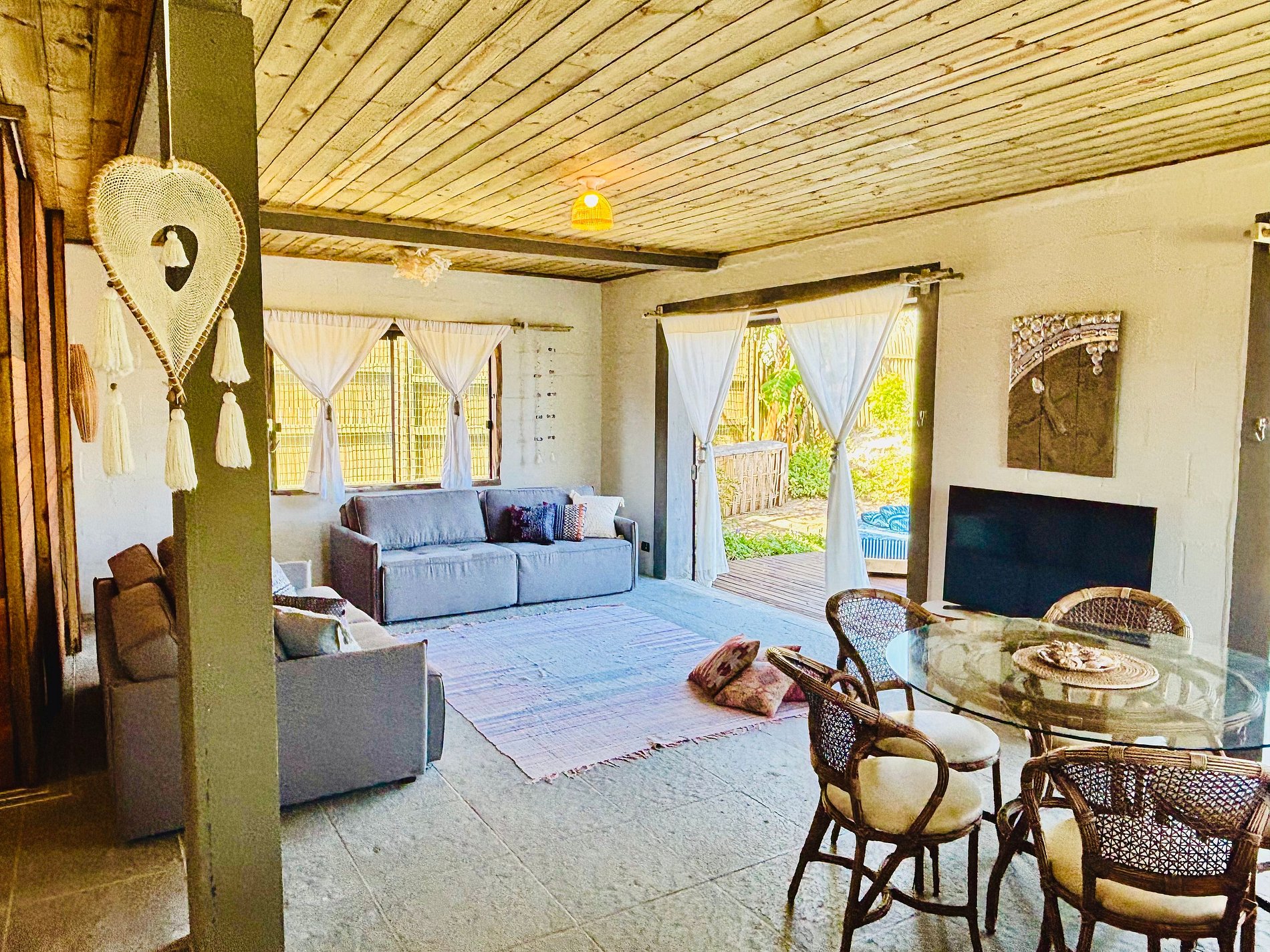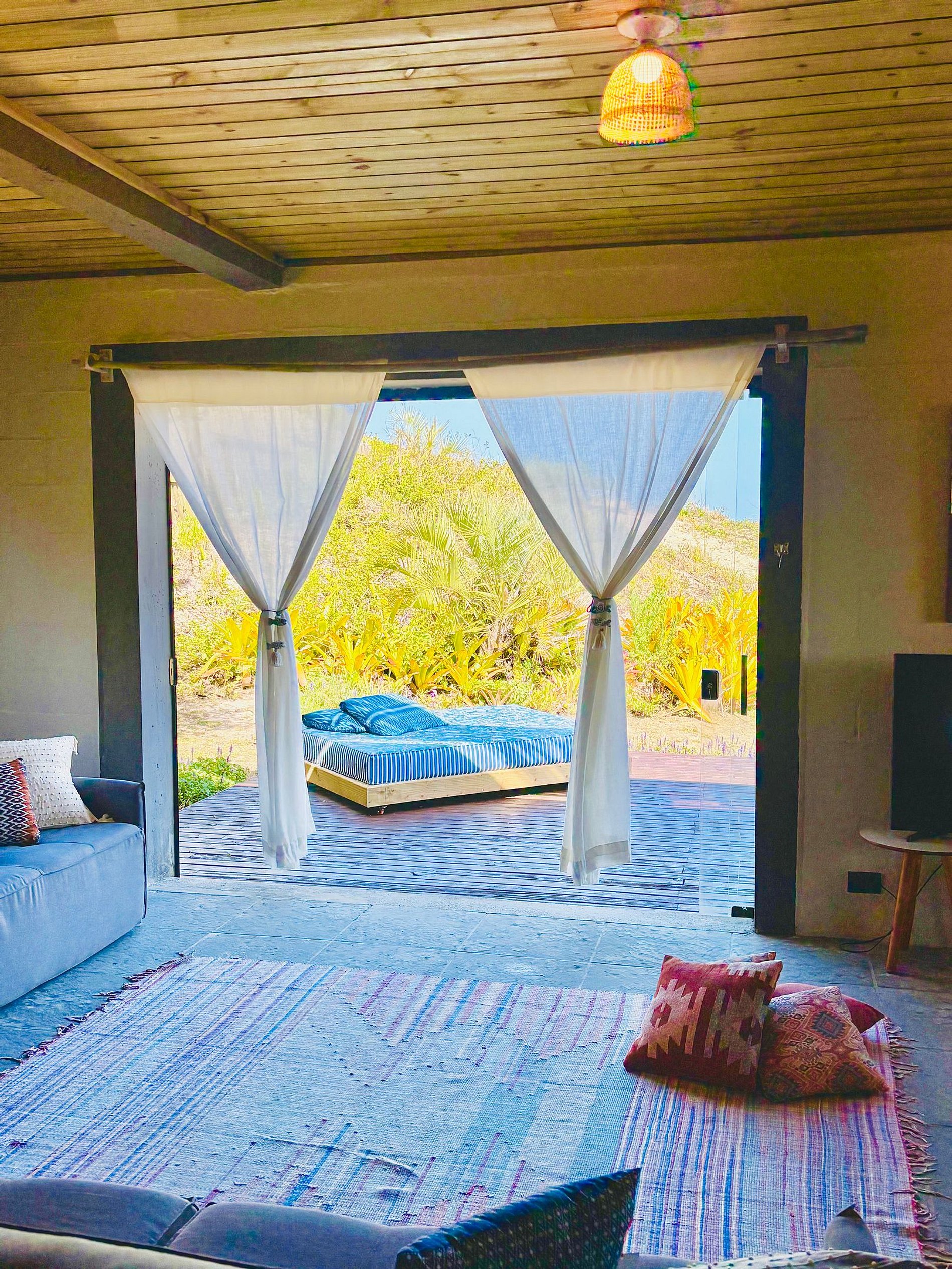 Compreende apenas ao andar térreo da casa. Acomoda 8 pessoas mas temos possibilidade de adequar para mais pessoas, como famílias e grupos. Painéis de correr permitem termos uma suite e um quarto fechados, ambos com ar condicionado. Ha mais um banheiro grande. A sala com seu sofá gigante e a cozinha e suas mesas rusticas, fazem parte deste grande espaço integrado, abertas para o deck em frente as dunas. O jardim e o espaço para fogueira estão disponíveis para uso compartilhado.